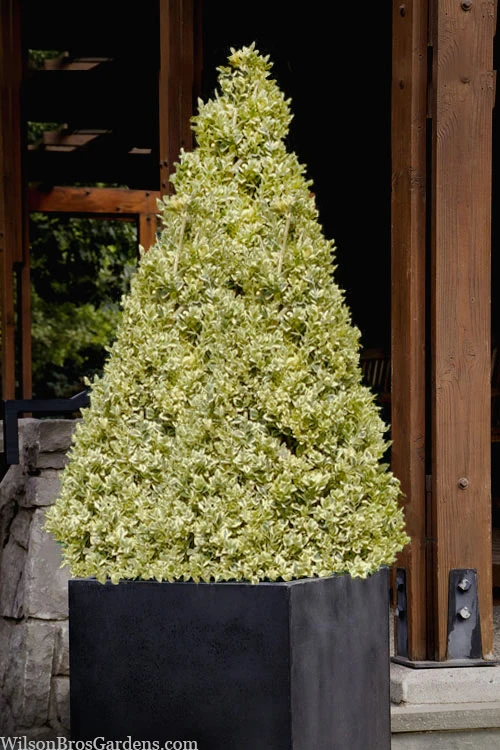 Exceptionally versatile, the Elegans Boxwood is one you can let grow naturally to its open and elegant pyramidal form, or it can be sheared tightly into interesting topiary shapes, including globes, pyramids, columns, mounds, or ovals. It features bright, variegated foliage with oval, evergreen leaves that have dark blue-green centers surrounded by a broad white margin. From a distance, the plant will appear nearly white in partial shade. If exposed to full sun or afternoon sun, the leaves will take on a soft-yellow cast. If left to grow naturally, the plant will grow to around 5 feet tall and 3 to 4 feet wide at its base. However, it can be maintained at half that size with annual spring trimming, which removes about half the length of its new growth. Very easy to grow and adaptable, Elegans Boxwood is a terrific accent or focal point in small garden spaces. You can use two to frame an entrance or several in a grouping or colorful hedge.