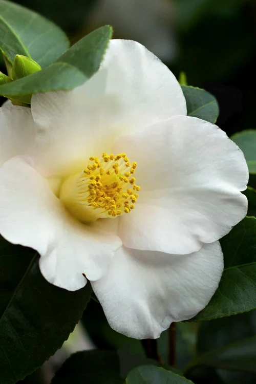 One of the most cold hardy of white flowering Camellia cultivars, originating in the northern range of Korea, ‘Korean Snow’ can handle temperatures from 0 to 5F as far north as USDA Zone 6b. Heralding the arrival of spring, in late winter (late February in our gardens) simplistically beautiful, glowing 3 to 4 inch single flowers with pure white petals surrounding a prominent cylinder of golden yellow stamens begin to emerge and continue through early spring. The blooms stand out remarkably well against foliage of dark green glossy leaves that are rounded at the tips rather than pointed, and are excellent for cutting and display in a vase or floral arrangement. At 8 to 12 feet tall and 6 to 8 feet wide, Korean Snow is a good fit for small to medium size gardens or as espalier or a corner plant in home foundation plants. As it grows taller lower branches can be removed to form a highly attractive, small evergreen flowering tree.